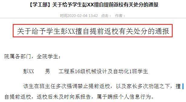 这2名学生在确认收到学校不得提前返校的通知后,仍然不顾省教育厅《关于2020年全省春季学期延期开学的通知》所明确的“所有学生不得提前返校”的要求,以及学校相关管理规定,不听劝阻,在当前严峻的疫情防控形势下,擅自提前返校。