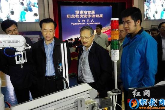 (副省长李友志[左二]在省教育厅厅长王柯敏[右二]的陪同下参观湖南职业教育发展情况展览)