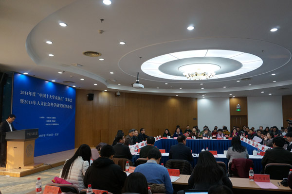 2015年1月13日,2014年度“中国十大学术热点”发布会暨2015年社会科学研究展望论坛在中国人民大学举行。会议正式发布了2014年度“中国十大学术热点”,分别是:1.社会主义核心价值观的培育和践行;2.依法治国和国家治理现代化;3.儒家思想的政治哲学解读;4.微时代的文化传播与话语表达;5.中国经济新常态与国家发展战略转型;6.中国社会治理体制创新;7.甲午战争与东亚历史进程;8.老龄化背景下的养老服务体系优化;9.教育综合改革背景下招生考试制度的理性探究;10.边疆民族问题研究。